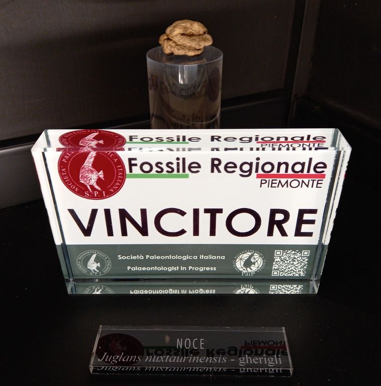 Si tratta di un gheriglio di noce appartenente alla specie Juglans nux-taurinensis riferibile a un intervallo di tempo compreso tra 7,254 e 5,96 milioni di anni (Miocene superiore), risultato il più votato in Piemonte nell’ambito dell’iniziativa “Fossili regionali”, nata dalla sinergia tra il gruppo dei giovani della Palaeontologist in Progress e il consiglio della Società Paleontologica Italiana, e preparata con l’aiuto di numerosi paleontologi italiani, con l’intento di favorire la divulgazione e la conoscenza delle ricchezze del patrimonio paleontologico del nostro paese.