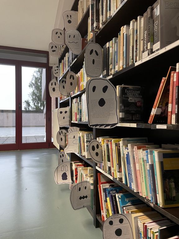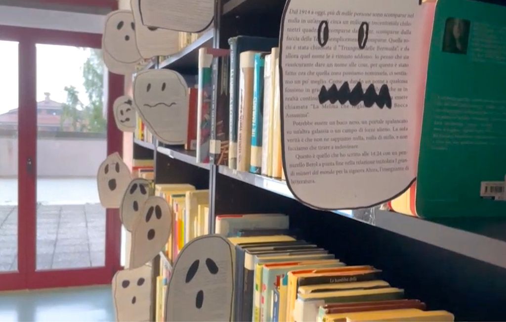 Nella biblioteca della scuola media di Ceresole d’Alba sono comparsi piccoli fantasmi: è la trovata della classe 2A che ha trasformato pagine di libri (fotocopiate) in creature paurose per rendere più divertente cercare volumi e leggere.