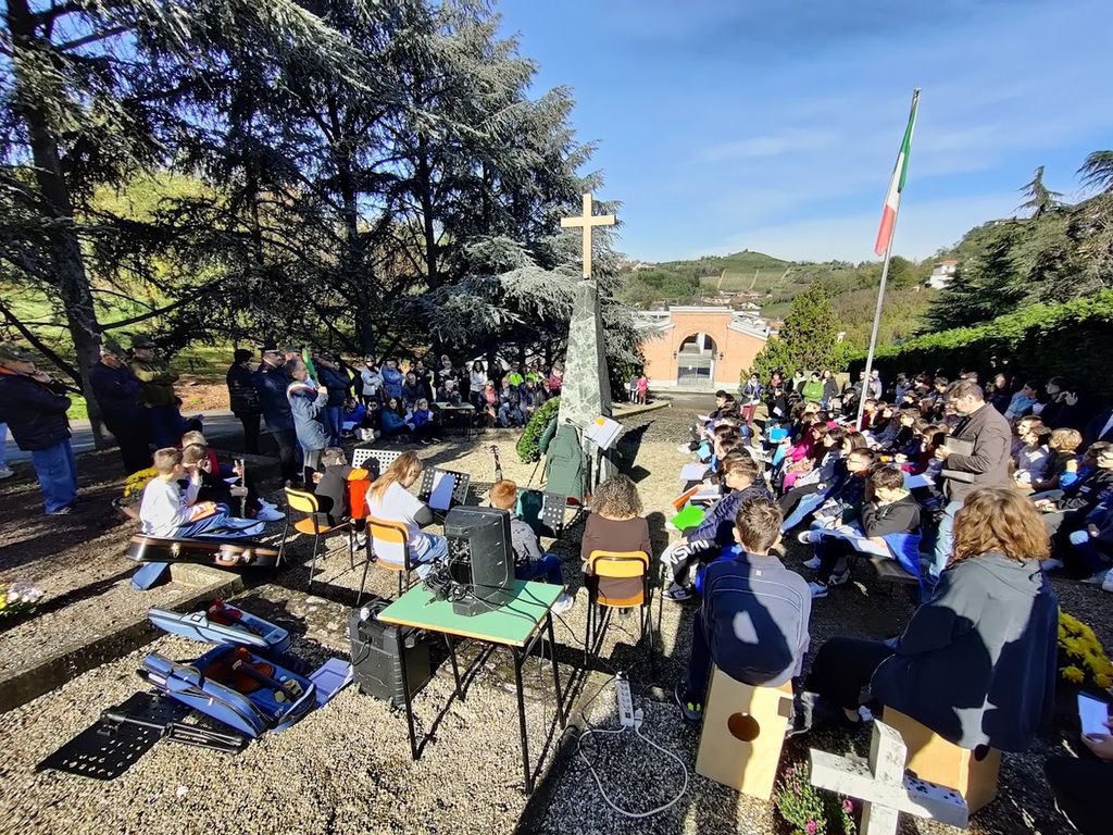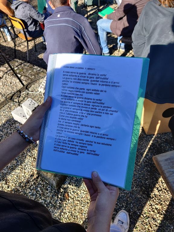 Gli studenti delle scuole elementari e della primaria di primo grado hanno letto alcuni testi tratti dagli scritti di autori come Rigoni Stern, Bertold Brecht e Anna Frank ed eseguito alcuni brani musicali, tra cui 'La Guerra di Piero' di Fabrizio De Andrè, 'A cosa serve la guerra' di Edoardo Bennato e 'Il mio nome è mai più' del trio LigaJovaPelù.