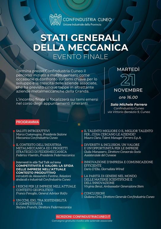 Dai saluti introduttivi di Marco Costamagna, presidente Sezione Meccanica Confindustria Cuneo, all’intervento di Federico Visentin, presidente Federmeccanica, che analizzerà “Il contesto dell’industria Metalmeccanica ed i progetti strategici di Federmeccanica”. Fulcro dell’appuntamento sarà il Ted Talk intitolato “Competitività e valori: la sfida delle imprese nell’attuale contesto produttivo”, introdotto da Alessandro Fantino, relazioni sindacali e industriali Confindustria Cuneo. “I rischi per le imprese nell’attuale contesto geopolitico” verranno presentati da Franco Fenoglio, General Advisor Rolfo, mentre Stefano Franchi, direttore Federmeccanica, punterà l’attenzione su “Un Ccnl Esg, tra sostenibilità e competitività”. Il tema delle risorse umane verrà sviluppato grazie agli interventi di Mauro Clara, talent manager Ferrero Spa (“Il talento migliore o il miglior talento per… cosa cercano le aziende?”) e Giulia Manassero, direttore Consorzio Socio Assistenziale del Cuneese, (“Diversity & inclusion, un valore e un’opportunità per le imprese”). L’ampio dibattito sull’innovazione verrà alimentato dall’intervento “Innovazione d’impresa e comunicazione efficiente”, a cura di Dario D’Elia, giornalista Wired, e da “La parità di genere nel mondo delle materie scientifiche e dell’innovazione”, condotto da Virginia Benzi, ambassador Generazione Stem.