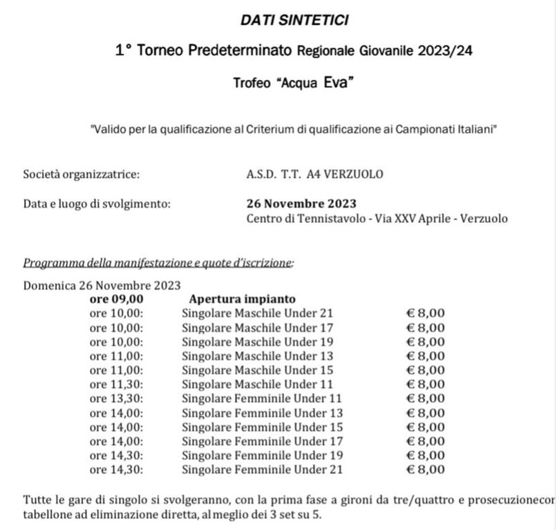 Un appuntamento e uno spettacolo per tutti che coinvolgerà appassionati e amanti di questo meraviglioso sport che unisce tecnica e forza e spirito di gruppo. La blasonata Società di tennistavolo A4 Verzuolo che ospiterà gli eventi presenterà molti atleti alle manifestazioni, giovani di grandi prospettive nazionali che daranno vita a vere e proprie battaglie di gioco sui campi, dove trionferanno sport rispetto e amicizia.