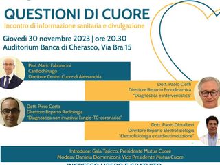 Giovedì 30 novembre alle ore 20,30 all’Auditorium Banca di Cherasco, a Roreto di Cherasco in Via Bra 15, si svolgerà un interessante incontro dal titolo “Questioni di cuore”.