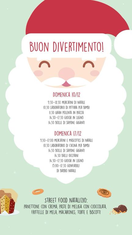 Un'attenzione particolare sarà rivolta ai bambini, per i quali sono previste varie attività: truccabimbi, bolle giganti, mascottes di Natale, laboratori, gonfiabili, giochi in legno, mentre il pubblico potrà passeggiare tra i mercatini e assaporare lo street food natalizio (dai panettoni ai biscotti, dalle frittelle di mela a paste e torte).