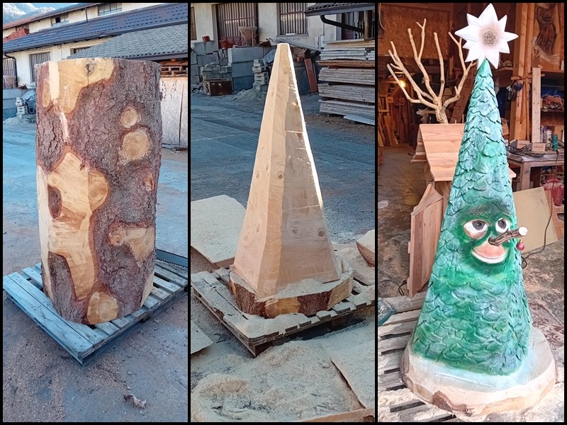 Ebbene, da quel grande abete è stata recuperata una sezione di tronco tagliata alla base che è stata portata nel laboratorio “magico” di Barba Brisiu, l'artista della motosega.