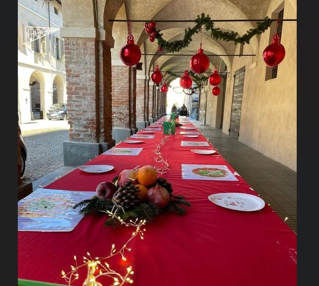 Centrotavola decorati e disegni completano l’opera, trasformando i portici del palazzo Galli Della Mantica in un ideale salone delle feste: un allestimento al quale tutti potranno contribuire, aggiungendo a quelli realizzati dai bambini, piatti con i nomi degli invitati al pasto natalizio.