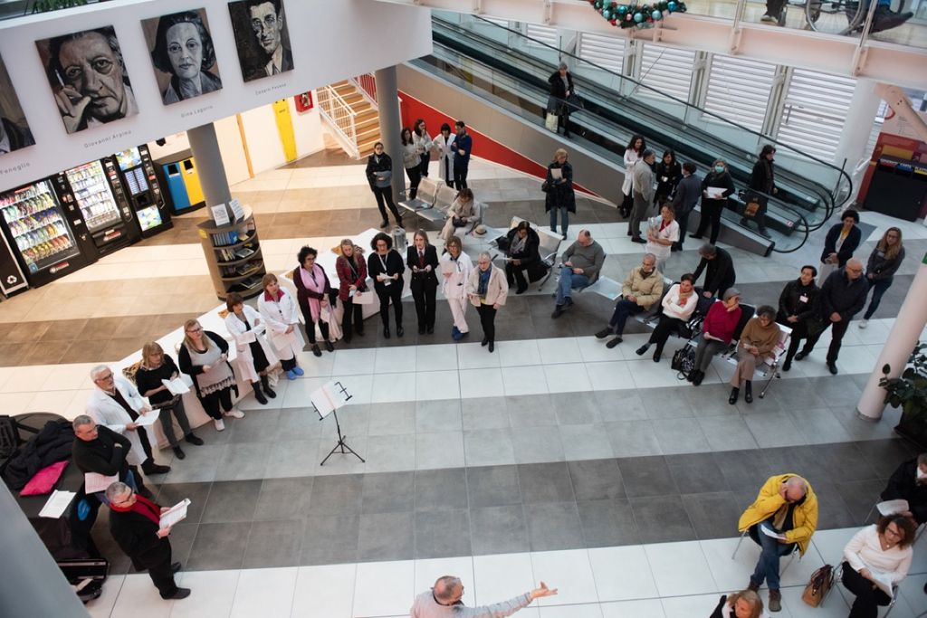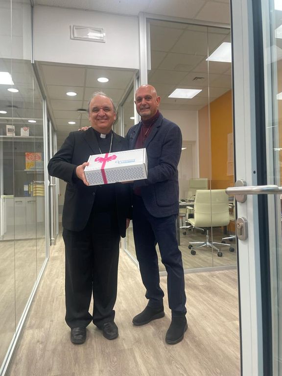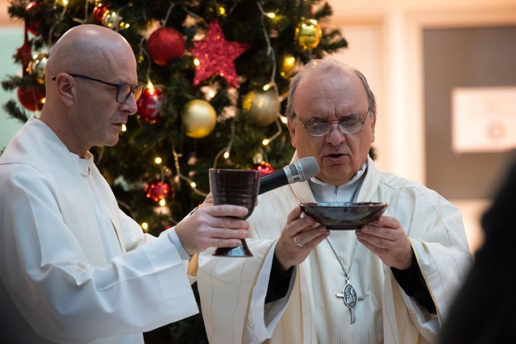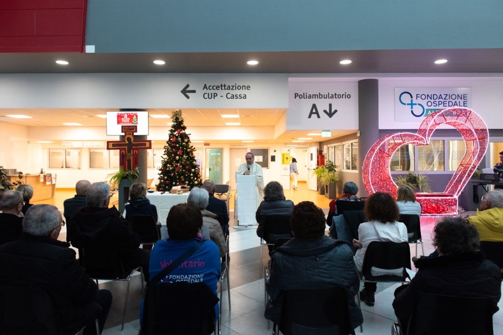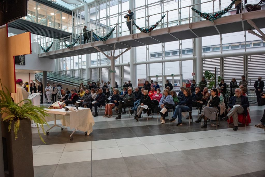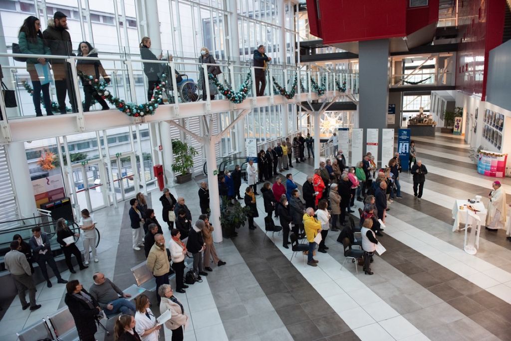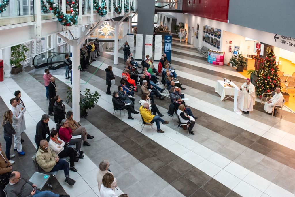 Una bella e toccante cerimonia quella che si è svolta nel pomeriggio di oggi, 21 dicembre, all’interno dell’Ospedale “Michele e Pietro Ferrero” di Verduno, nello spazio che il vescovo di Alba, monsignor Marco Brunetti, ha definito "un’agorà", ovvero la “piazza” sita al terzo piano, dove ha sede anche l’ufficio di direzione della Fondazione Ospedale Alba - Bra e dove, solitamente, fa sfoggio di se un bellissimo pianoforte a coda che, di tanto in tanto, qualche passante si ferma a suonare.