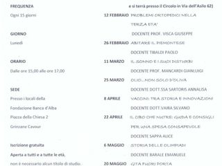 Sarà variegato il programma dei temi trattati, così come l'elenco dei professionisti e degli specialisti chiamati come relatori. Si parlerà di insonnia e di vaccini, si approfondirà il piemontese, si daranno consigli sull'olio d'oliva o sulla spesa consapevole.