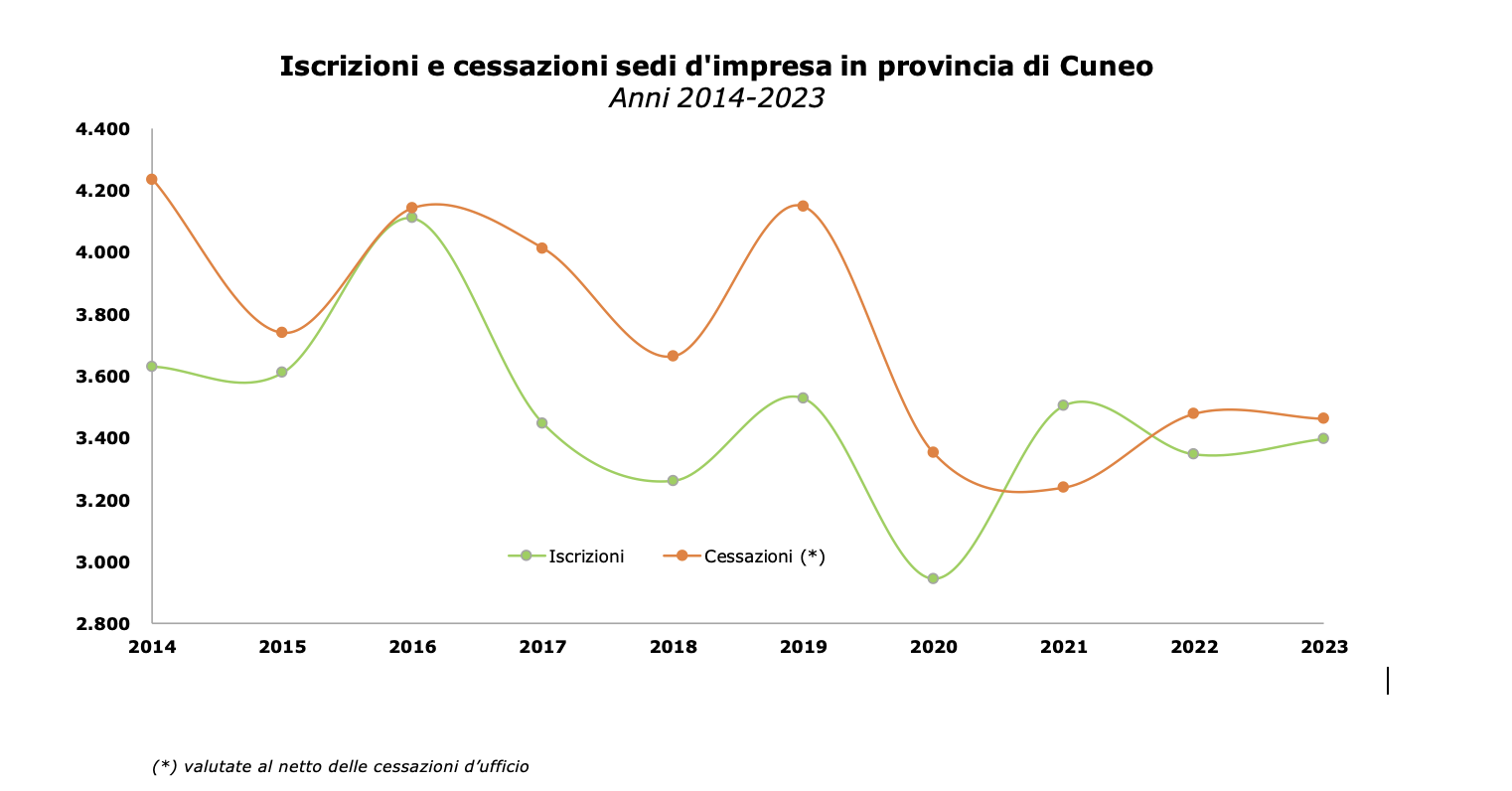 Nel periodo gennaio-dicembre 2023 la Camera di commercio di Cuneo registra la nascita di 3.397 nuove iniziative imprenditoriali, 50 in meno (-1,47%) rispetto all’anno precedente, e 3.462 cessazioni (al netto delle cancellazioni d’ufficio) 16 in meno (-0,6%) rispetto al 2022.