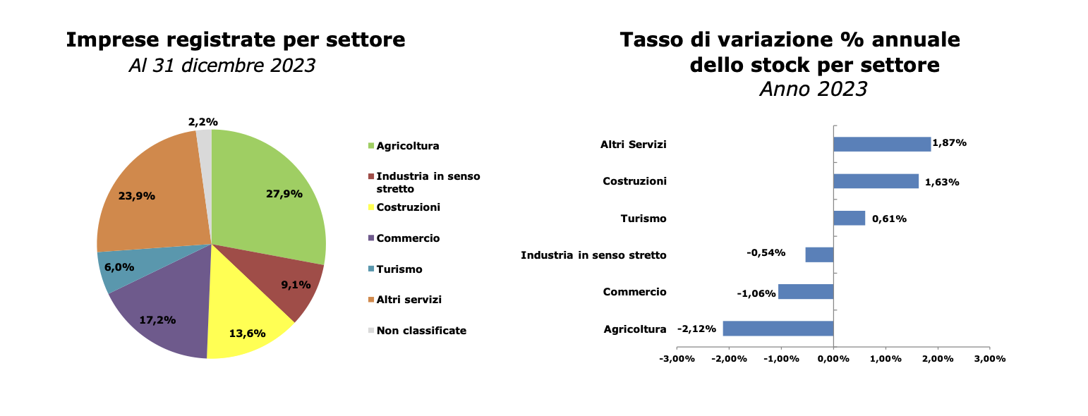 Lo stock di imprese a fine dicembre 2023 è pari a 65.123 sedi, mentre sono 80.784 le localizzazioni (comprensive di unità locali; erano 80.842 a fine 2022).