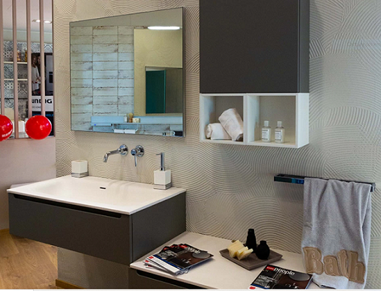 Idro, composizione per bagno, in laccato opaco color grigio, Altezza 180 cm, lunghezza 185 cm. Completo di lavabo e rubinetto a muro. Top: clistalplant bianco. Prezzo: € 3.190