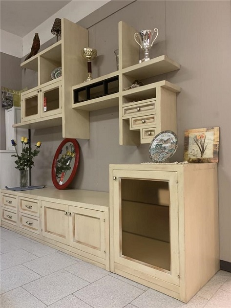 Parete Soggiorno Decapé. Parete soggiorno in legno verniciata decapé componibile in diversi formati in base alle misure. Prezzo: € 2.500