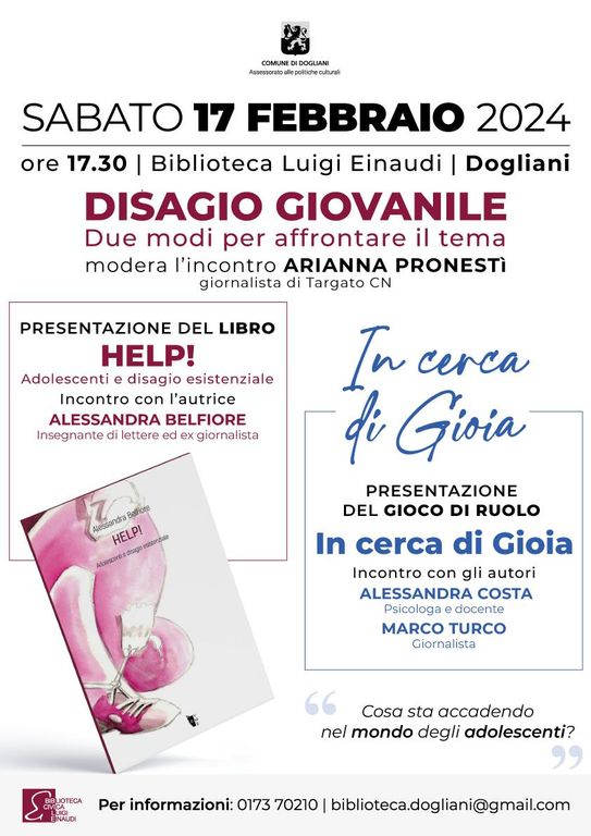 Sabato 17 febbraio alle 17.30 presso la Biblioteca “L. Einaudi” di Dogliani, si proverà ad affrontare l’argomento con la professoressa Alessandra Belfiore, autrice del libro “Help!” (Villaggio Maori Edizioni, 2022) e la psicologa e docente dott.ssa Alessandra Costa e il giornalista Marco Turco, autori del gioco di ruolo “In cerca di Gioia”.
