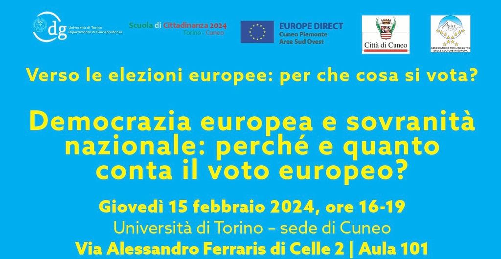 Il dipartimento di giurisprudenza dell’Università di Torino-Cuneo, in occasione delle elezioni europee che si terranno il giugno prossimo, ha organizzato un ciclo di quattro incontri aperti alla cittadinanza, con l’obiettivo di contribuire all’esercizio di un voto consapevole.