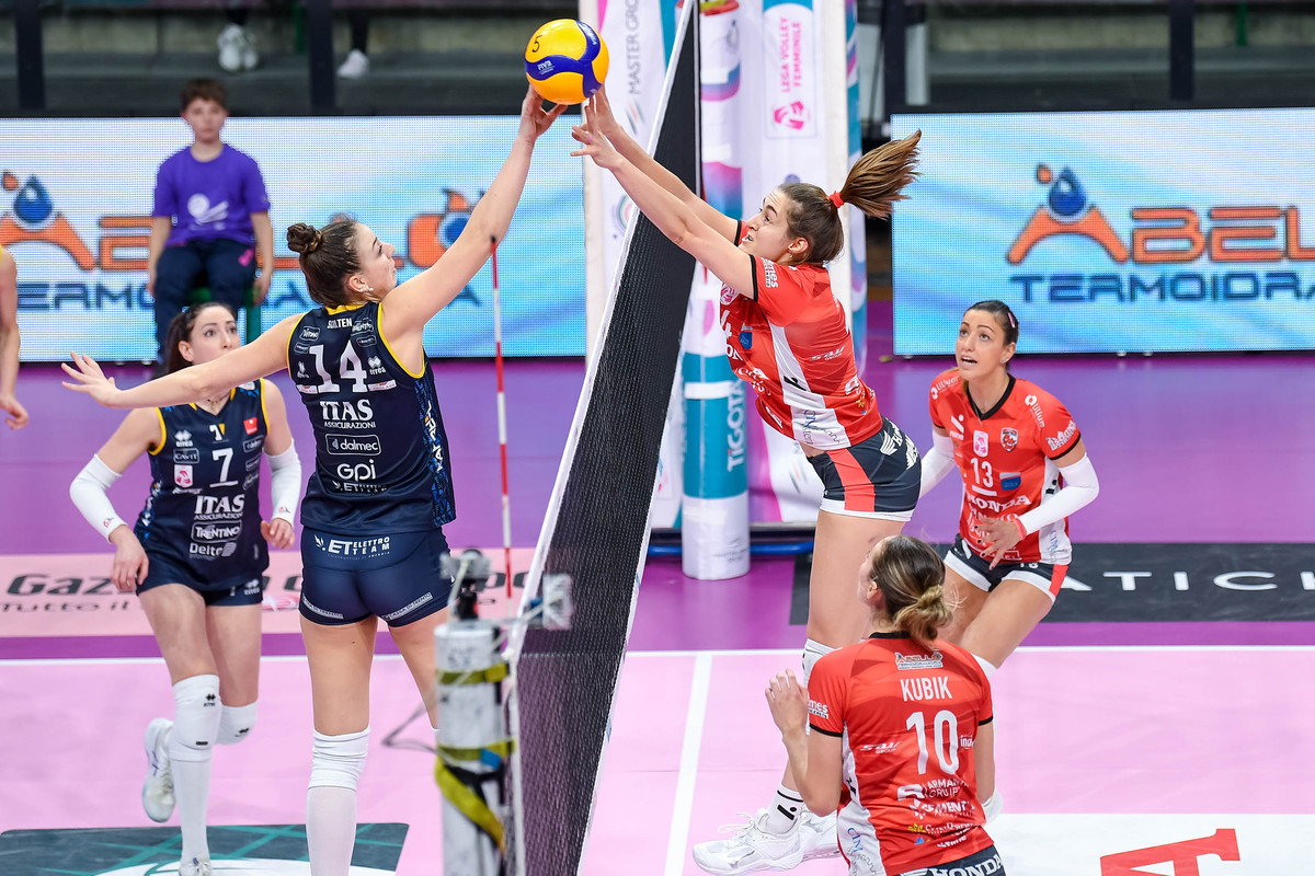 Quarto, decisivo, set con Trento che va sull'1-3 con il muro di Marconato, poi pareggio a 4 di Cuneo su errore in attacco di Scholten e nuovo doppio vantaggio trentino (4-6) con la palla out di Tanase. L'Itas va sul +3 con Marconato (4-7), Bellano ferma il gioco, ma arriva un altro block su Tanase (Marconato) per il doppiaggio sul 4-8, mentre Michieletto mette a terra il 4-9. Nella file piemontesi entra Kubik per una spenta Tanase, Signorile a muro riduce lo svantaggio di un break (7-10) ma poi deve lasciare il campo insieme con Enweonwu per il cambio con Scola e Stigrot. Cuneo riparte: Haak mette giù il punto del -2 e sul 9-11, Kubik con un ace firma il punto del 10-11, ma poi c'è il muro a uno di Olivotto punti di Michieletto intervallati da un errore di Kubik per il 13-19. La partita ormai è in discesa per le ospiti che arrivano sul match ball (18-24) con l'errore di Hall, poi il sigillo lo mette un'invasione delle Gatte.