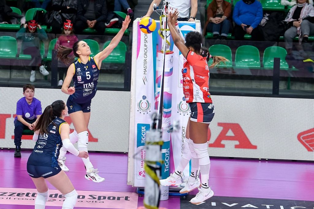 Trento parte bene anche nel secondo parziale: l'ace di Guiducci sul 3-5 induce Bellano a richiamare subito in panchina Stigrot inserendo Kubik, ma sono ancora le ospiti ad andare a punto prima su attacco di Scholten e subito dopo a muro con Olivotto che ferma Kubik: sul 3-7 c'è il time out di Bellano. L'americana si riscatta e con una pipe trova il punto del -2 (5-7) e Enweonwu dalla seconda linea riduce lo svantaggio a -1 (7-8). Il punto del pareggio è opera di Haak (9-9), poi l'opposta di Cuneo porta le Gatte avanti per la prima volta nel set sul 10-9, ma è un flash: Marconato a muro, Michieletto con una battuta punto e subito dopo un altro block, stavolta di Scherbhan, riportano le trentine avanti 12-15. Arriva l'ultima interruzione del gioco da parte di Bellano, ma è ancora l'Itas ad incrementare il vantaggio (13-18) con Scherban e Olivotto. Il coach biancorosso cambia Signorile con Scola, intanto Enweonwu sbaglia anche l'attacco del 13-19, poi Michieletto affonda il colpo del 15-22. Il punto del 2-0 per l'Itas (18-25) arriva dalla solita Michieletto.