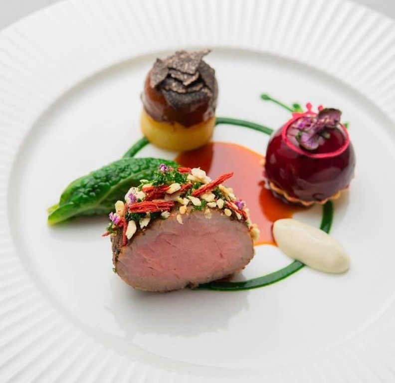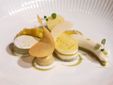 Il piatto principale era un secondo, un filetto di vitello aromatico, stufato di vitello con royale di foie gras glassato alla barbabietola, patate al tartufo e funghi, verze stufate e infine per dessert mousse al cioccolato bianco aromatizzato al limone Verdello di Sicilia, gelato latticello e verbena, cake tiepido agli agrumi, variazione di pistacchio e ananas.