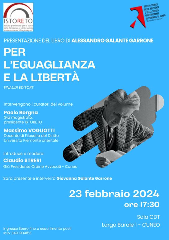 Nella Sala Polivalente dell'Istituto Storico della Resistenza e della Società Contemporanea della provincia di Cuneo, in largo Barale 1 a Cuneo, venerdì 23 febbraio alle 17.30 verrà presentato il libro “Per l'uguaglianza e la libertà” di Alessandro Galante Garrone, edito Einaudi.