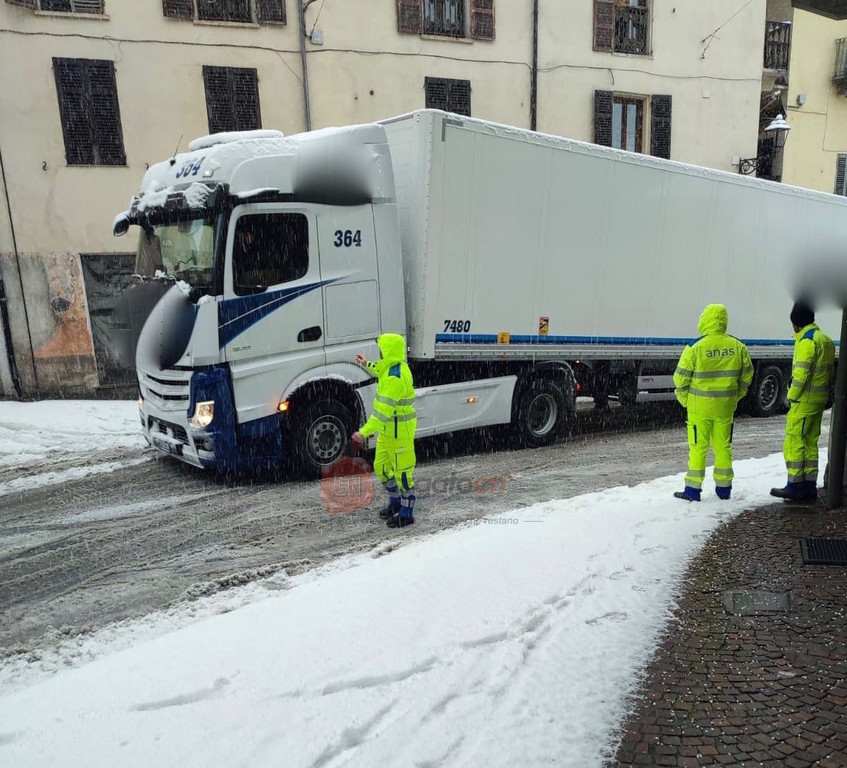 A Demonte un camion è rimasto fermo per quasi due ore nel centro del paese, con le catene a bordo ma non montate.