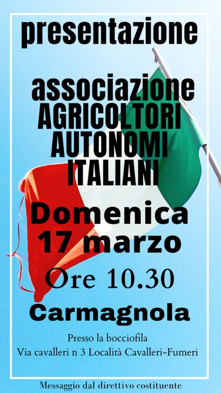 Ormai è ufficiale. Gli Agricoltori Autonomi Italiani si costituiranno in associazione domenica 17 marzo a Carmagnola. L'appuntamento è previsto alle 10.30 presso la bocciofila in via Civalleri, località Cavalleri-Fumeri.
