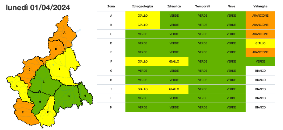 Col bollettino emesso pochi minuti fa (lunedì 1° aprile) Arpa Piemonte ha rinnovato l’allerta arancione per rischio valanghe nelle valli Vairata, Maira e Stura (domani, martedì 2 aprile, scenderà a gialla), mentre il livello di allarme è giallo per la valle Po (anche qui per rischio valanghe) e per la valle Tanaro, in quest’ultimo caso per rischio idrogeologico. In queste due ultime zone la previsione per domani è di ritorno al verde.