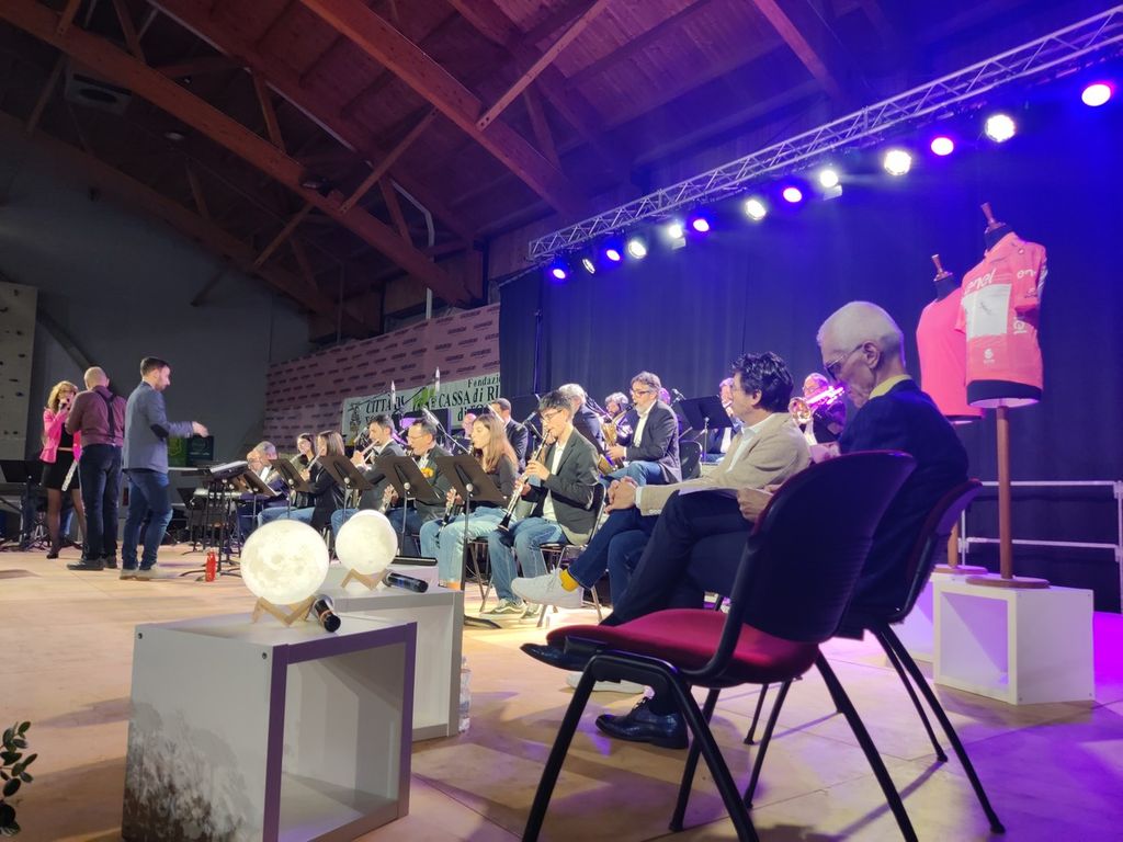 In un alternarsi di intrattenimento musicale e approfondimento sportivo, la serata si è aperta con i saluti di Gianfranco Riorda nella doppia veste di presidente della Fondazione e del Comitato di tappa: "Questa sera abbiamo l'onore di aver in platea il Prefetto Fabrizia Triolo, accompagnata dalla dottoressa Bambagiotti. E che piacere vedere in mezzo a noi Paolo De Chiesa, sciatore della storica Valanga Azzurra! Ho sempre pensato che musica e ciclismo avessero molte affinità: si tratta di un gioco di squadra, fondamentale è il ritmo, necessari passione e tenacia, ma soprattutto esiste nel ciclismo un tifo trasversale sano e non fazioso, come nella musica.