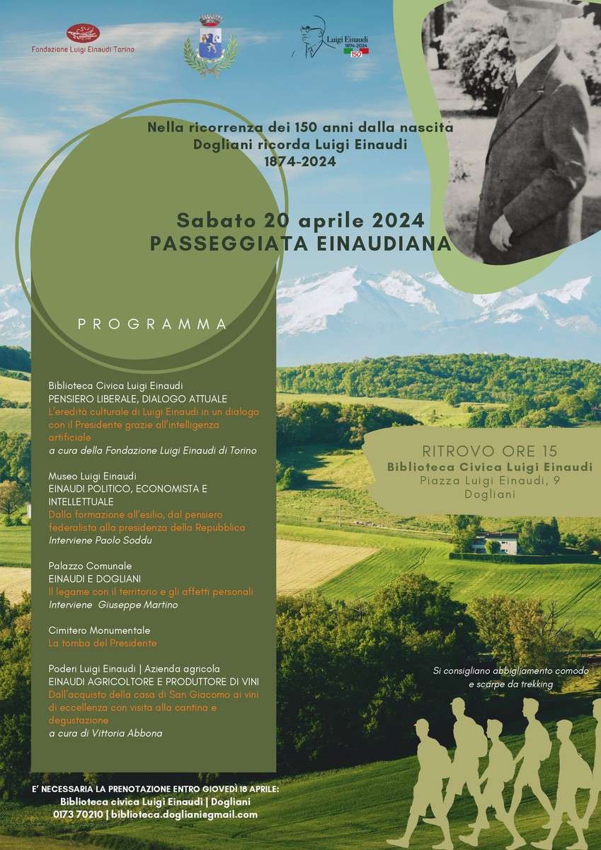 colline di Dogliani alla scoperta dei luoghi chiave della vita del Presidente, realizzata in sinergia con la Fondazione Luigi Einaudi onlus di Torino, sotto lโegida del Comitato Nazionale per i 150 anni dalla nascita del Presidente.