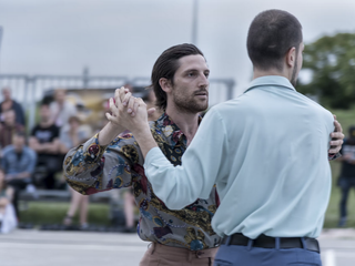 In Save the last dance for me Alessandro Sciarroni lavora assieme ai danzatori Gianmaria Borzillo e Giovanfrancesco Giannini sui passi di un ballo bolognese chiamato Polka Chinata. Si tratta di una danza di corteggiamento eseguita in origine da soli uomini e risalente ai primi del ‘900: fisicamente impegnativa, quasi acrobatica, prevede che i danzatori abbracciati l’un l’altro, girino vorticosamente mentre si piegano sulle ginocchia quasi fino a terra.
