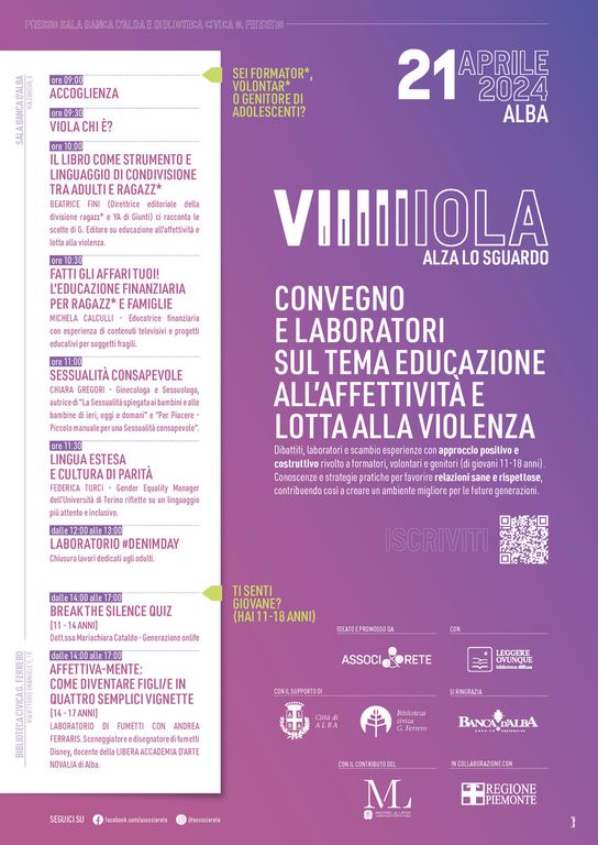 Il 21 aprile 2024 partecipa a VIOLA un evento innovativo e coinvolgente che si propone di promuovere la riflessione sul tema "Educazione all'affettività e lotta alla violenza" con un approccio positivo e costruttivo e relatori di fama nazionale, promosso con il contributo del Ministero del Lavoro e Politiche Sociali, in collaborazione con la Regione Piemonte.