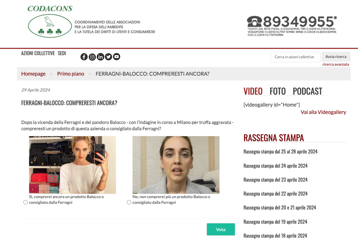 "Dopo la vicenda della Ferragni e del pandoro Balocco - è la domanda –, con l'indagine in corso a Milano per truffa aggravata, compreresti un prodotto di questa azienda o consigliato dalla Ferragni?", con due opzioni di risposta in caso positivo o negativo.