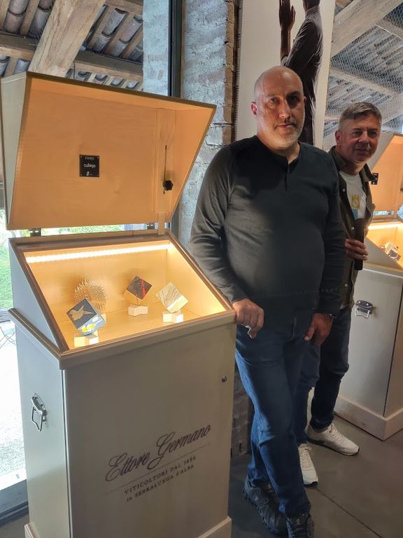 Ieri, domenica 5 maggio, si è svolta nel famoso birrificio piozzese la presentazione delle quattro teche con alcune informazioni circa il loro futuro. Ogni contenitore ha uno sponsor, Ceretto, Revello Caffè, Ettore Germano, Strucchi, e ogni contenitore racchiude 4 bocce quadre, realizzate in materiali diversi, tutte espressioni della creatività di 17 artisti.