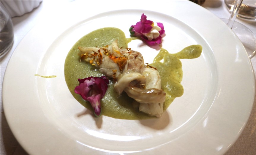Come secondo un branzino in crosta con fiore di Nasturzio, vellutata di lattuga e Bocche di Leone ripiene di ricotta.
