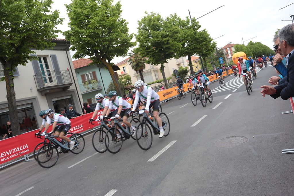Aspettando l'arrivo dei protagonisti del Giro Fossano ha rivolto i suoi applausi ai corridori del GiroE, al termine della frazione partita da Cherasco.