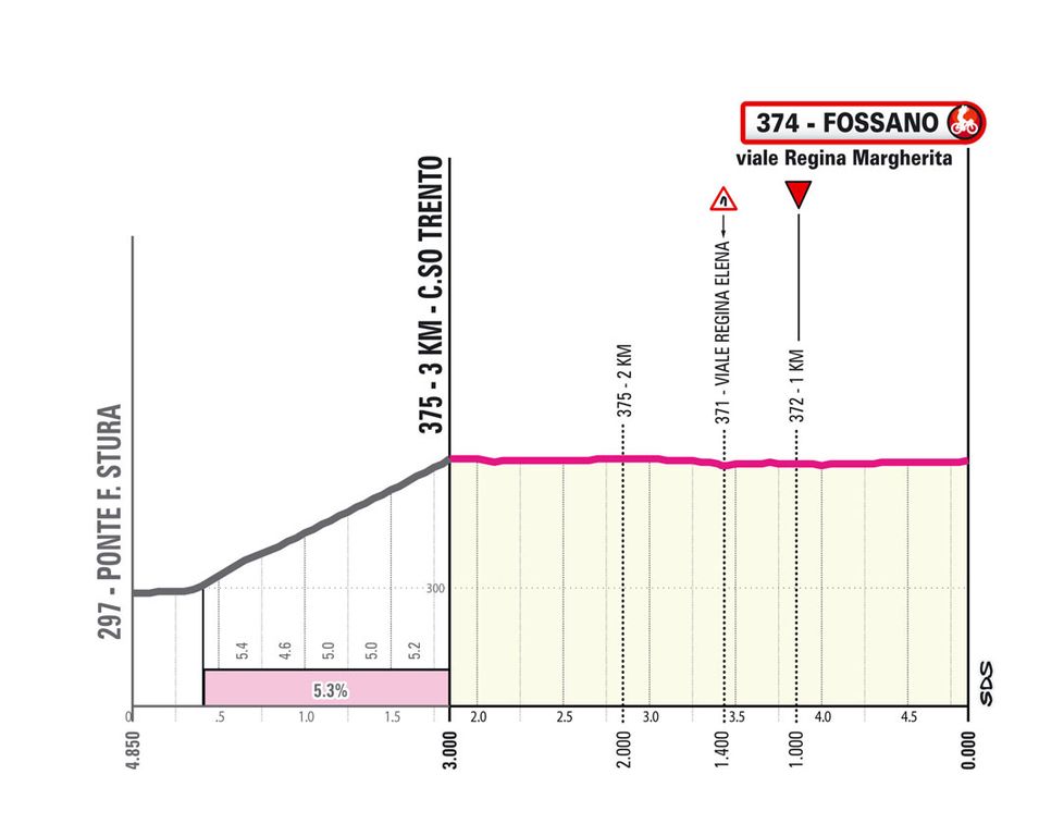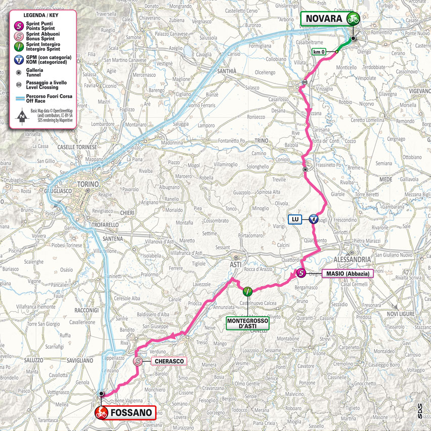 Il percorso si snoda tra le suggestive campagne del Novarese e del Cuneese, regalando panorami incantevoli su vigneti, risaie e borghi storici. La breve salita di Lu costituisce una delle poche e brevi asperità di giornata. Finale caratterizzato dallo strappetto di Cherasco fino all’ultima breve ascesa che porta a Fossano. Gli ultimi 3 km saranno praticamente rettilinei con una sola curva a gomito a 1300 metri dall’arrivo. Si preannuncia un entusiasmo incontenibile con diverse iniziative e momenti che celebreranno il passaggio del Giro d'Italia.
