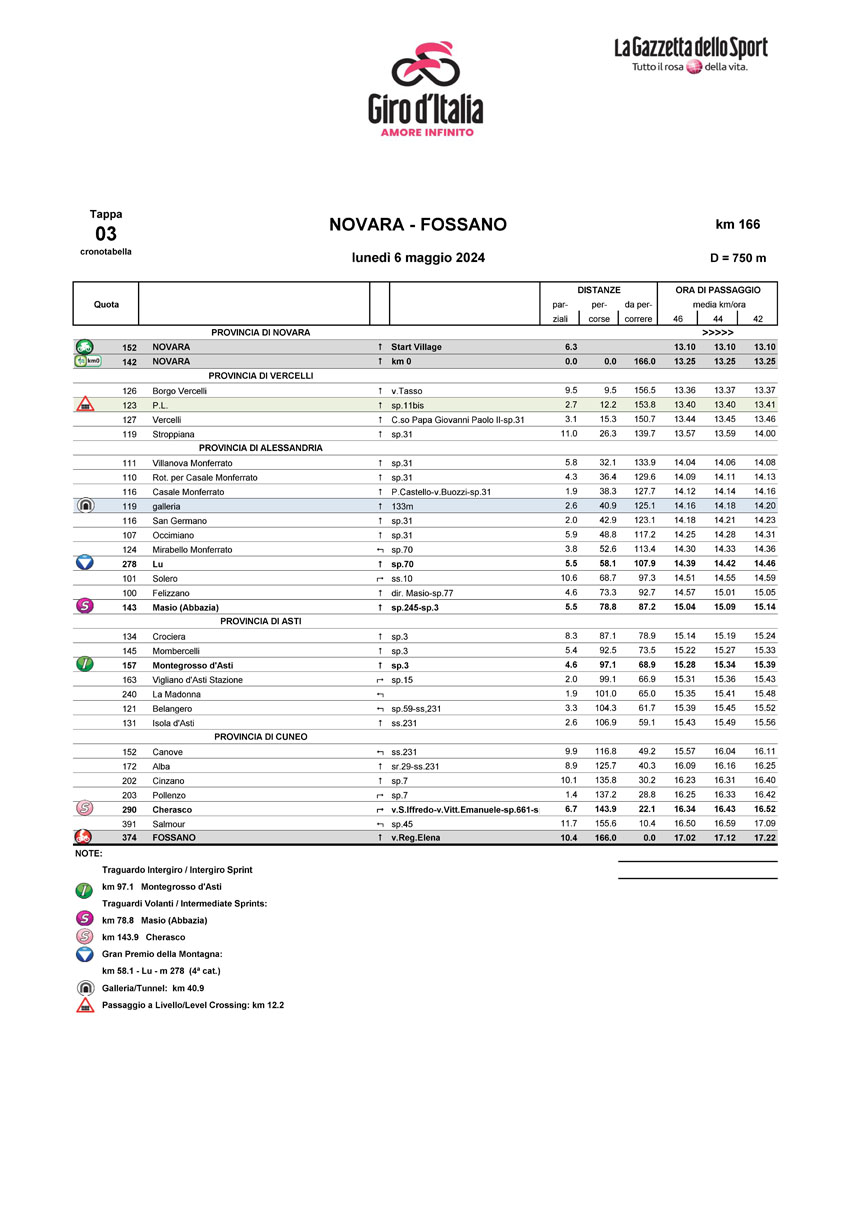 Oggi (lunedì 6 maggio) è in programma la Novara-Fossano, terza tappa del Giro con arrivo nella città degli Acaja intorno alle 17. Nei 166 chilometri previsti i territori cuneesi toccati saranno Canove di Govone, Baraccone di Castagnito, Vaccheria di Guarene; quindi Alba col passaggio al Rondò e a Mussotto, Cinzano di Santa Vittoria, Pollenzo, Cherasco e Salmour, sino all'arrivo di viale Regina Elena a Fossano.