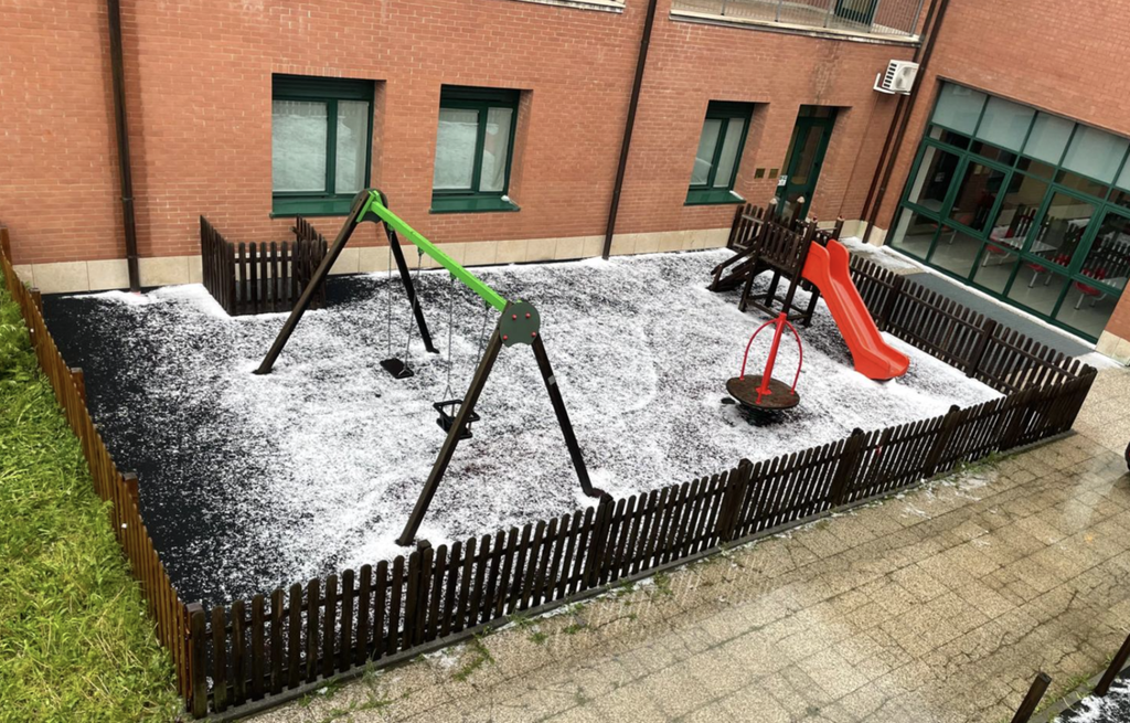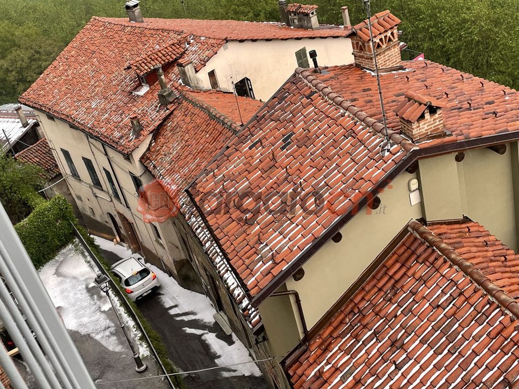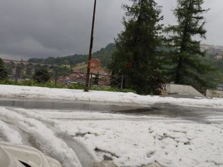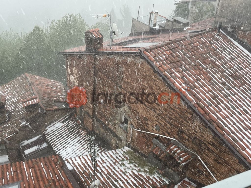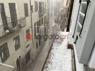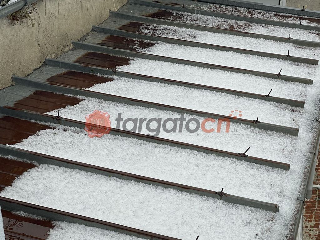 La forte pioggia è stata accompagnata dalla grandine, che ha imbiancato tetti e strade del centro storico.