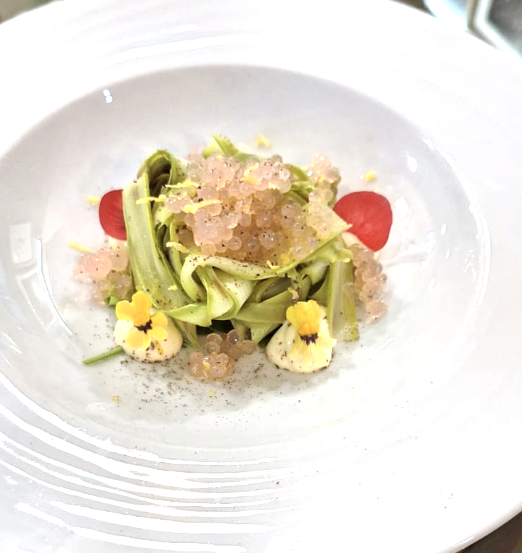 Tagliatelle di asparagi con Caviale di begonia e maionese al limone.