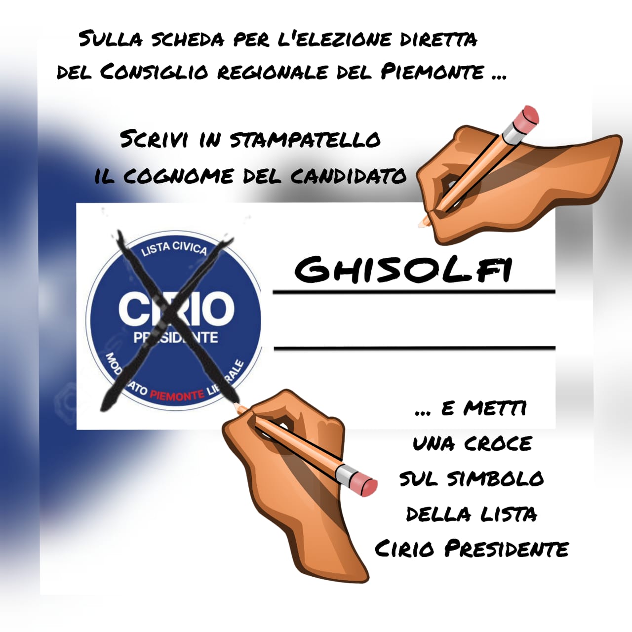 Per non perdere questo treno, e per portare i "mercati della gente" al centro della politica regionale, occorre anzitutto recarsi ai seggi elettorali i prossimi 8 e 9 giugno e ritirare la scheda per l'elezione diretta del Consiglio regionale del Piemonte, mettendo una croce sul simbolo della lista civica Cirio Presidente e scrivendo accanto, a caratteri stampatelli maiuscoli, il cognome di Ghisolfi.