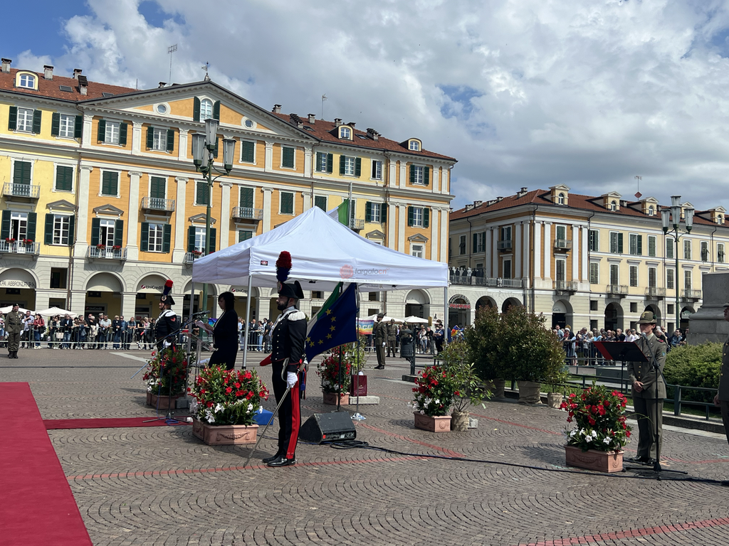 La celebrazione ha preso il via con la cerimonia dell'Alzabandiera, l'intervento di un picchetto armato del II° Reggimento Alpini di Cuneo e di una rappresentanza interforze dei Corpi Armati e di Soccorso Pubblico nonché della Banda Musicale "Duccio Galimberti" Città di Cuneo.