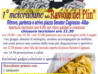 Domenica 16 giugno con apertura delle iscrizioni dalle ore 9 partirà dalla piazza Senator Cagnasso di Alba il 1° motoraduno delle "Raviole del plin", motogiro in memoria di Guido Bottino, già presidente del motoclub albese per 45 anni.