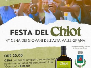 E’ fissata per la serata di sabato 29 giugno a Monterosso Grana la "Festa del Chiot", 4ª cena dei giovani della Valle Grana, organizzata dal Circolo Acli Monterosso col patrocinio del Comune di Monterosso Grana.