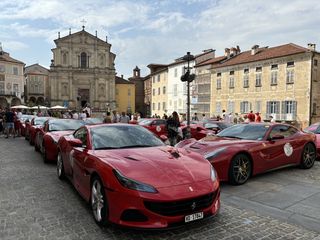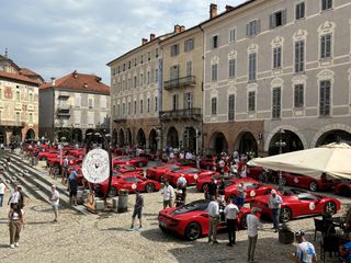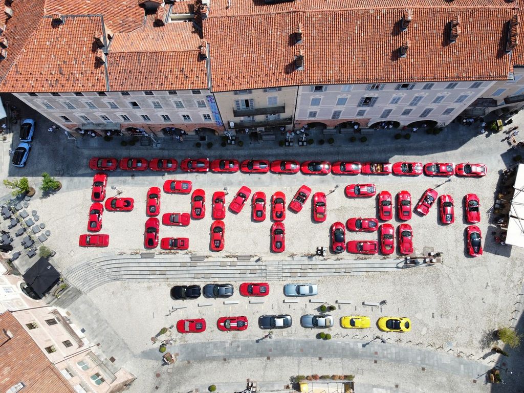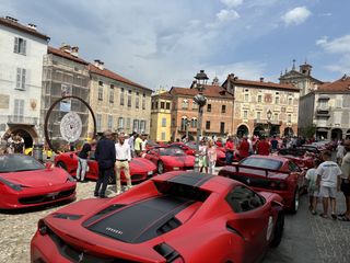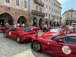 Partiranno nel primo pomeriggio per la "Salita in alta quota" verso Prato Nevoso le super car che, questa mattina, hanno dato vita alla scritta Ferrari su piazza Maggiore.