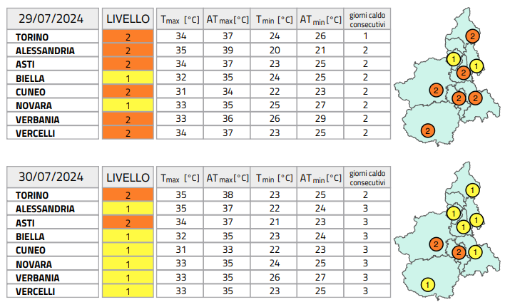 Non molto più sostenibile la situazione per la giornata di oggi (lunedì 29 luglio), per quale Arpa segnala un pericolo di livello 2 nella maggior parte delle province piemontesi: a Cuneo le temperature saranno comprese tra i 31°C e i 22°C (34°C e 23°C quella percepita).