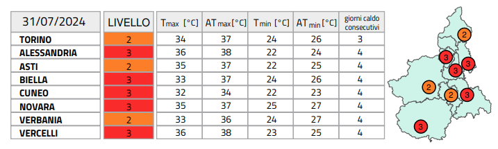 Arriverà con molta probabilità nella giornata di mercoledì 31 luglio la vera e propria ondata di calore annunciata sul Piemonte e che investirà anche la nostra provincia. Secondo quanto diramato dall’Arpa Piemonte nel suo ultimo bollettino sulle ondate di calore – pubblicato oggi, lunedì 29 luglio, sul portale ufficiale dell’ente – la giornata di mercoledì sarà per la maggior parte delle provincie piemontesi da vero e proprio “bollino rosso”.