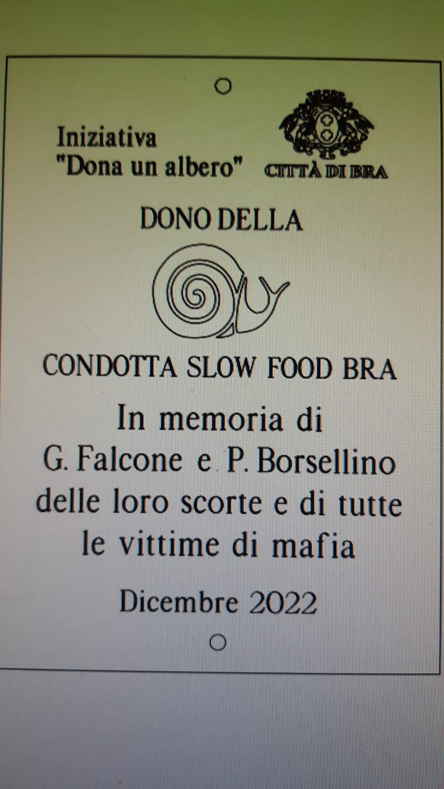 Nel dicembre 2022 Slow Food Bra, in accordo col Comune, donò alla collettività braidese una pianta che venne messa a dimora nell'area verde dedicata a "Falcone e Borsellino", i due simboli di lotta alla mafia che hanno pagato con la loro vita questo impegno. Durante l'inaugurazione, venne posta una targa che non solo voleva ricordare chi ha donato questa pianta, ma anche la motivazione: "In memoria di G. Falcone e P. Borsellino, delle loro scorte e di tutte le vittime di mafia".