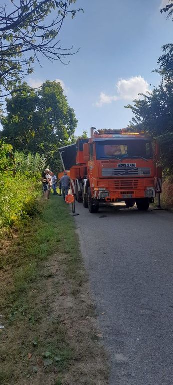 Disavventura per un tir che questo pomeriggio, lunedì 5 agosto, doveva scaricare del materiale in un'azienda di Vezza d'Alba.