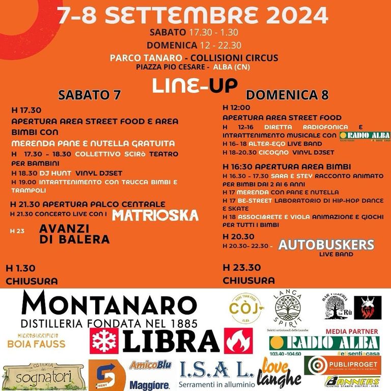 Domenica 8 settembre, le attività riprenderanno alle 12:00 con un'altra giornata di cibo e divertimento. Fino alle 16:00 la protagonista sarà Radio Alba con intrattenimento musicale e diretta radiofonica. Alle 18:00 il concerto degli Alter-ego seguito dal dj set su vinile di Cicogno.