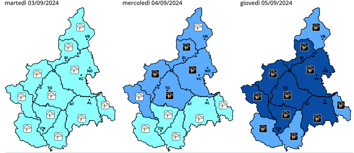Una settimana all’insegna dell’instabilità quella che ha aperto il mese di settembre. Dopo quelle diramate domenica e lunedì, l’Agenzia Regionale per l’Ambiente ha comunicato per oggi, martedì, temporali sparsi, in particolare sui rilievi seguita da una nuova allerta gialla emessa per domani, mercoledì 4, quando dal primo mattino è attesa un’intensificazione dei temporali sulla fascia centro occidentale, al confine tra le province di Torino e Cuneo, con valori anche forti, con grandinate e raffiche di vento.