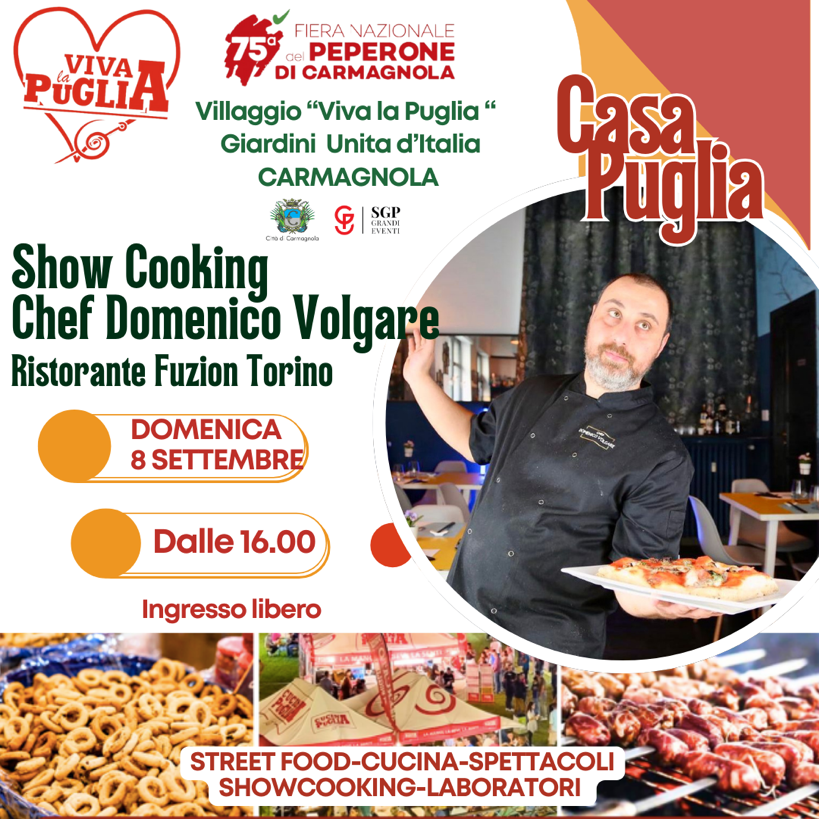 Viva la Puglia vi aspetta tutti i giorni negli orari della fiera con tutte le specialità Pugliesi Orecchiette,Bombette di Martina Franca ,Panzerotti, Focaccia Barese, le Friselle di Monopoli, i Pasticciotti Leccesi …e non può mancare il Peperone di Carmagnola che accompagnerà numerose ricette che troviamo presentate negli Show Cooking di questo week end a Casa Puglia a cura di alcuni Ristoratori Carmagnolesi e Domenica 8 Settembre ospite lo Chef Domenico Volgare Fuzion Torino a Casa Puglia è allestita nei Giardini Unità d’Italia ed è dedicata alla cucina regionale pugliese ospitando anche tradizione ed enogastronomia del Territorio .