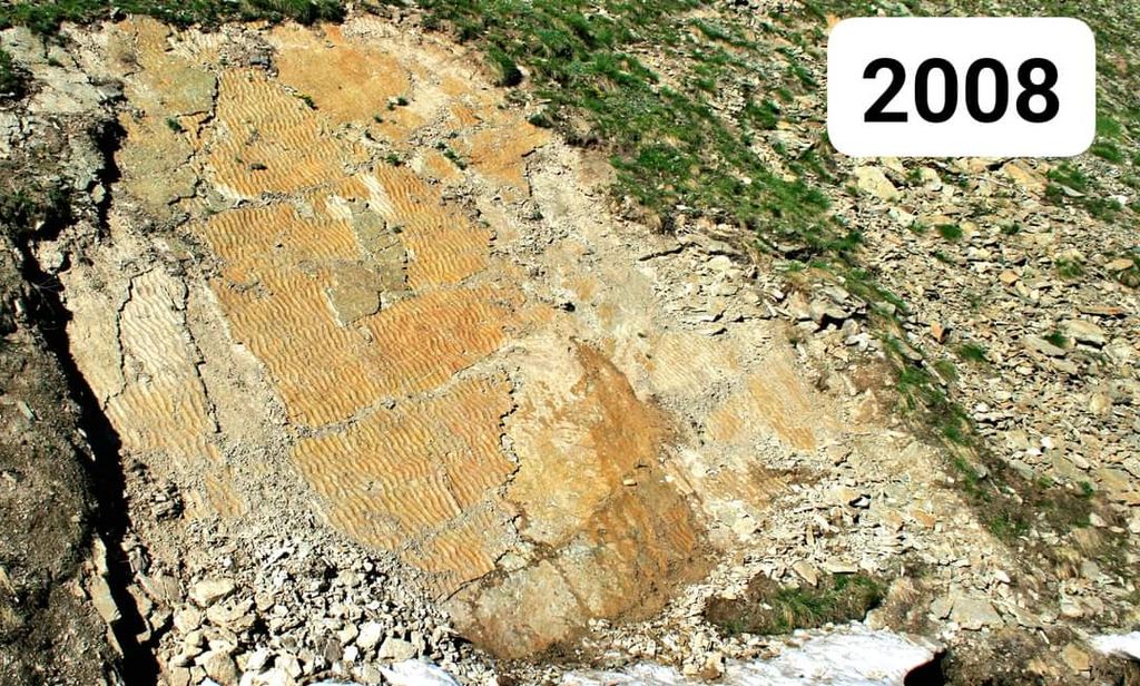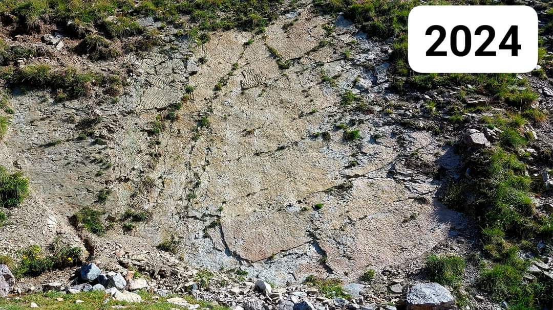 Risalgono a 250 milioni di anni fa e sono più antichi dei dinosauri, appartengono agli arcosauri della famiglia dei coccodrilli, i fossili ritrovati 16 anni fa sull'altopiano della Gardetta in alta valle Maira a 2200 metri di altitudine. E oggi stanno sgretolandosi. L'allarme è stato lanciato dal geologo e guida naturalistica Enrico Collo, anche consigliere di minoranza del Comune di Canosio, sui suoi canali social, dove ha riportato le immagini con l'evidente stato di frantumazione delle impronte.
