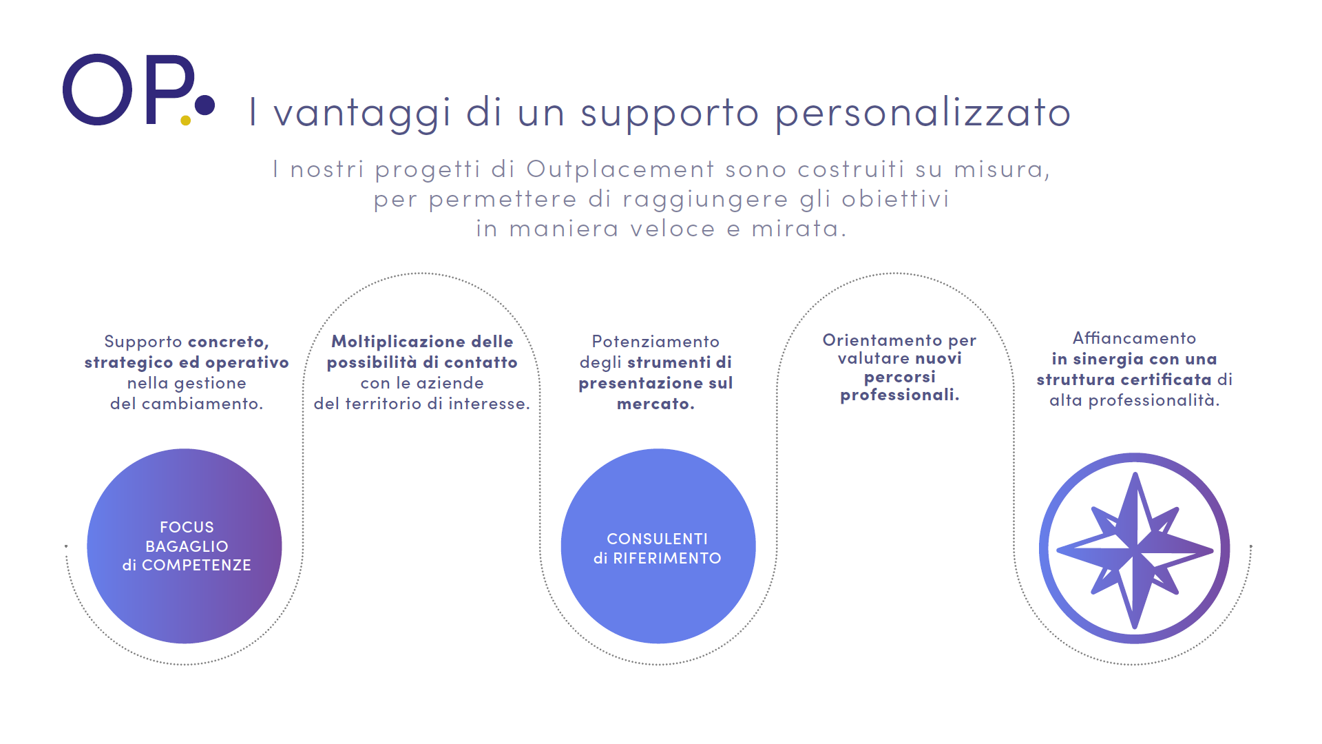 Il percorso di outplacement offerto da OPsolution è strutturato su misura per ogni candidato, basato su: